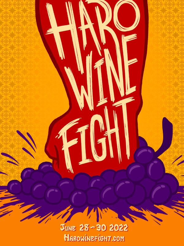 Haro Wine Fight is an event held in Haro, Spain where an annual balloon fight takes place, only with wine instead of water. Taking the keyword 'fight' literally, the design of the poster centers on a fist punching through grapes, creating a fun and kinetic image that captures the viewers attention.